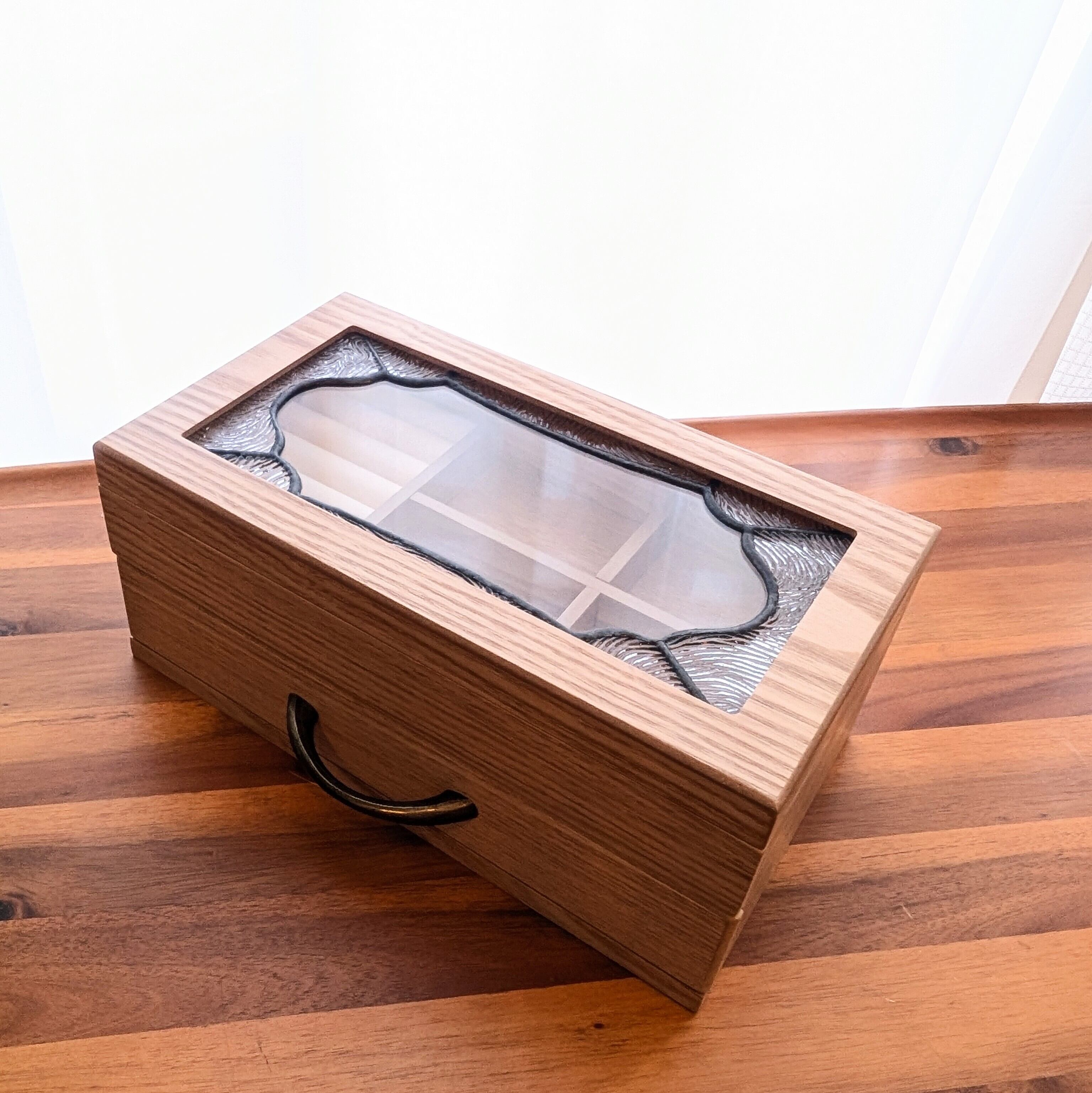 蓋を閉じて置くだけでも素敵ですが、開いた瞬間に光を受けるステンドグラスの模様やラインが印象的なアクセサリーケース。